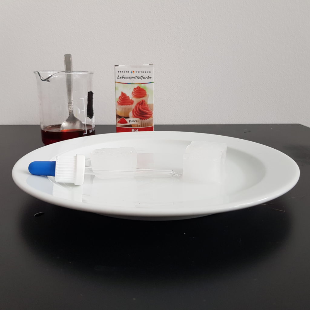 Now, you put the two ice cubes on the plate. Do you already see a difference between them? With the pipette, you start to drip the coloured water on the ice cube. Now, you should see the differences on the ice cubes pretty quickly. While the coloured water on the fresh water ice cube just rolls off, the coloured water on the salt water ice cubes stays on top and eventually starts to trickle down into the ice cube, as you see in Figure 2. If you look at it from above as in Figure 3, you can see that the salt water ice cube is coloured completely, while the fresh water ice cube stays like it is. Looking from the side as in Figure 4, you can see that the coloured water really penetrates into the ice cube. Now why is this?