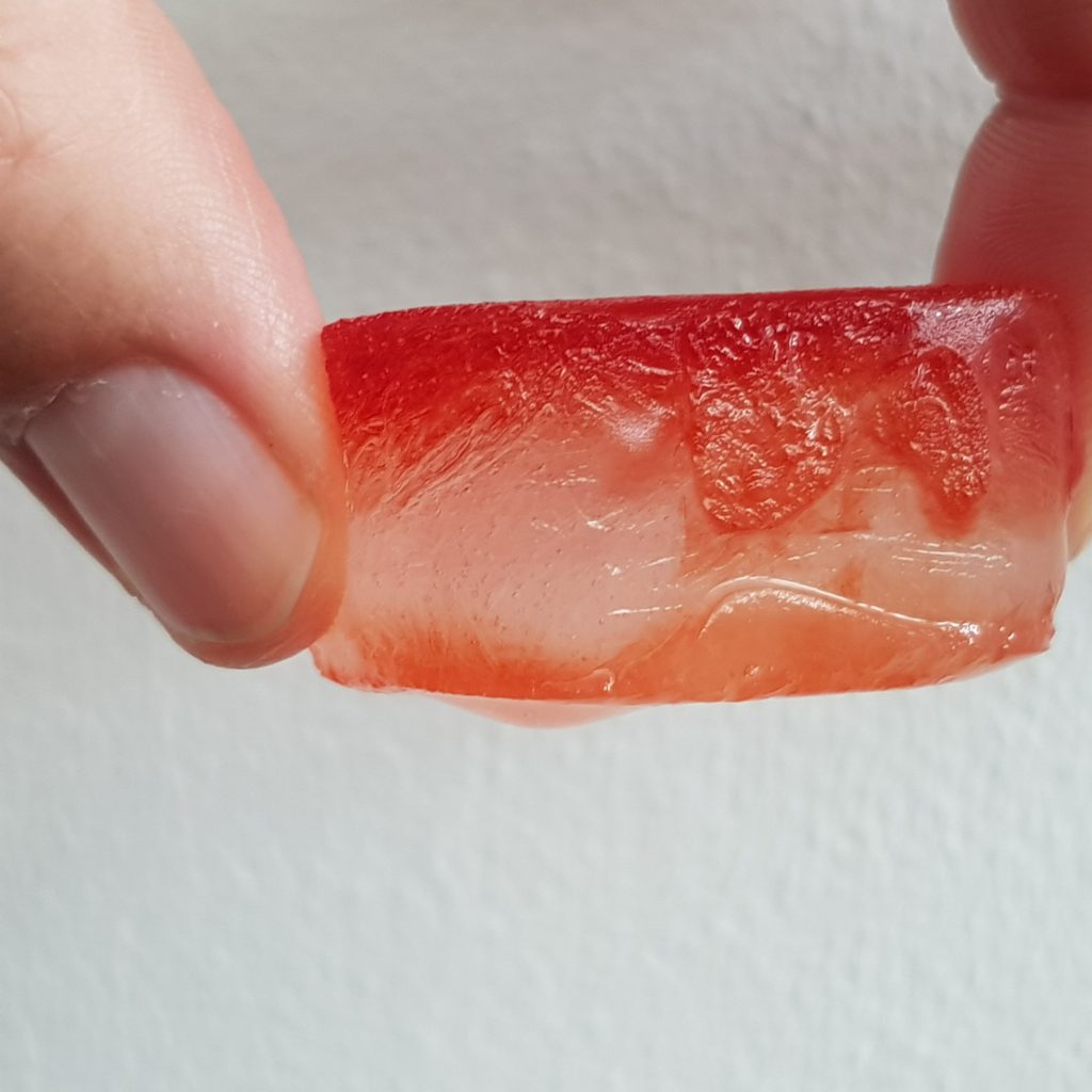 Therefore, you have parts within the salt ice cube with a lot of salt, all the salt which didn’t stay in the ice when it froze. There, you have only a very small amount of liquid water and a lot of salt, so the water has a very high salinity. This water is also called brine. More salt in the water means that it melts the ice around it (remember that salt lowers the freezing point). So, the brine starts to melt down its way through the ice cube, leaving something behind which we scientists call brine channels. These brine channels now take up the coloured water. You can see some of them in Figure 4 if you look carefully. This is why the salt water ice cube takes up the colour and the fresh water ice cube doesn’t.